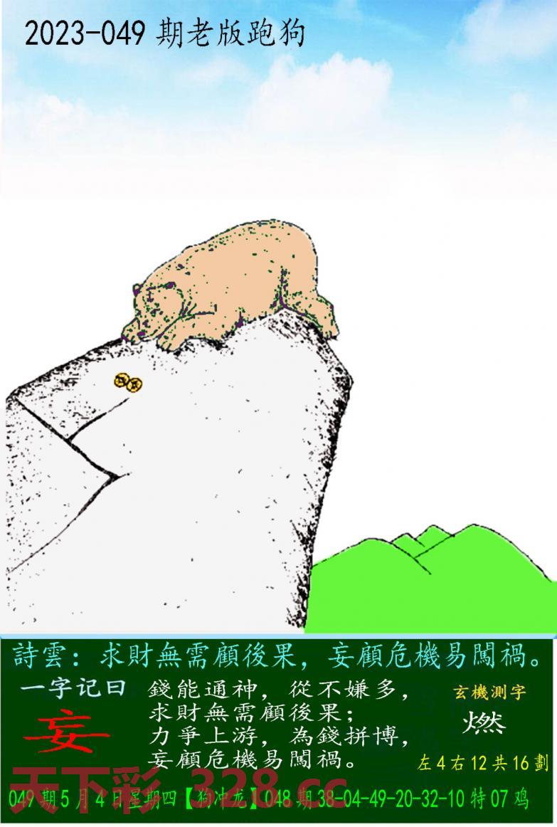 049期老版跑狗一字記之曰:【妄】 詩雲:求財無需顧後果,妄顧危機易闖禍。