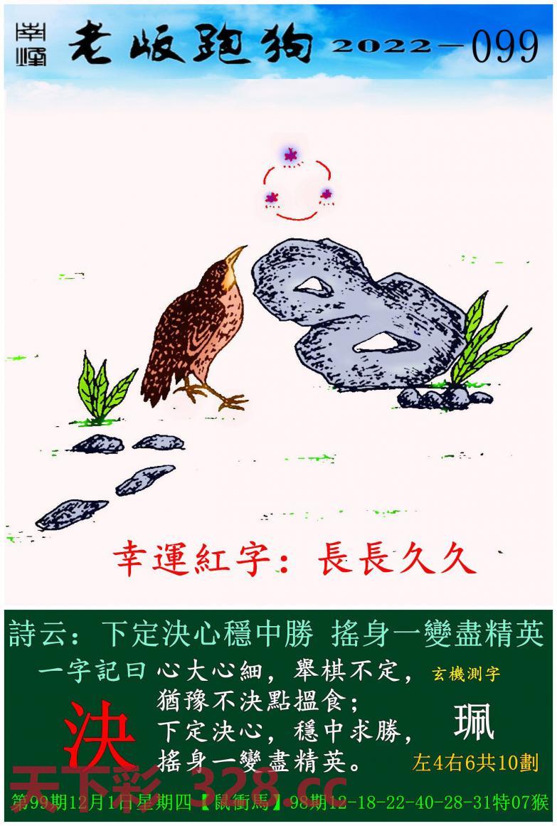 099期老版跑狗一字記之曰:【決】 詩雲:下定決心穩中勝,搖身一變盡精英。