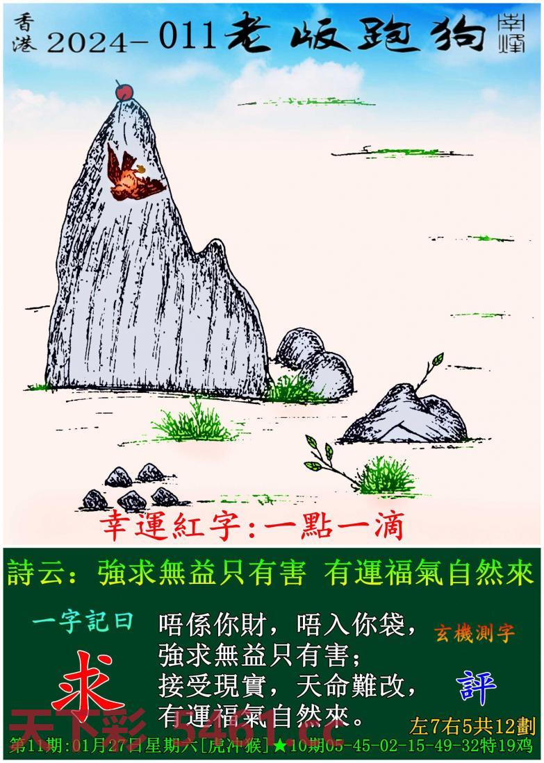 011期老版跑狗一字記之曰:【求】 詩雲:強求無益只有害,有運福氣自然來。
